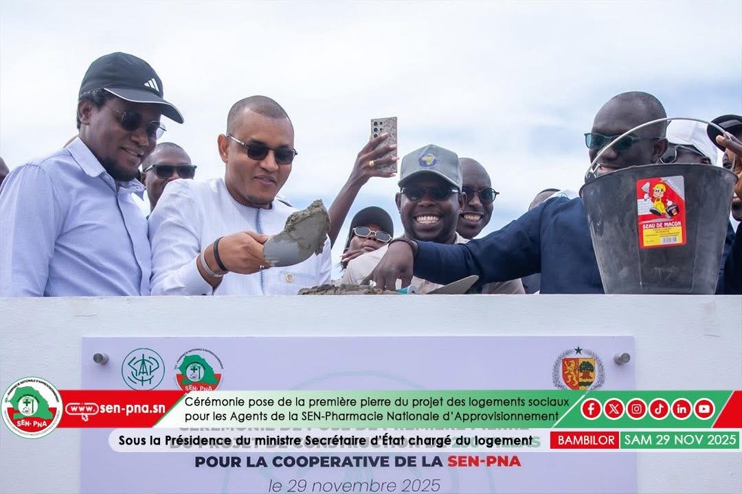 Ce samedi 29 novembre 2025, la pose de la première pierre du programme de 250 logements destinés aux travailleurs de la Pharmacie Nationale d’Approvisionnement (PNA) a été effectuée à Bambilor, lors d’une cérémonie présidée par le secrétaire d’État chargé du Logement, Momath Talla Ndao, en présence des autorités administratives, du directeur général de la SEN-PNA, Dr Seydou Diallo, et des partenaires financiers.